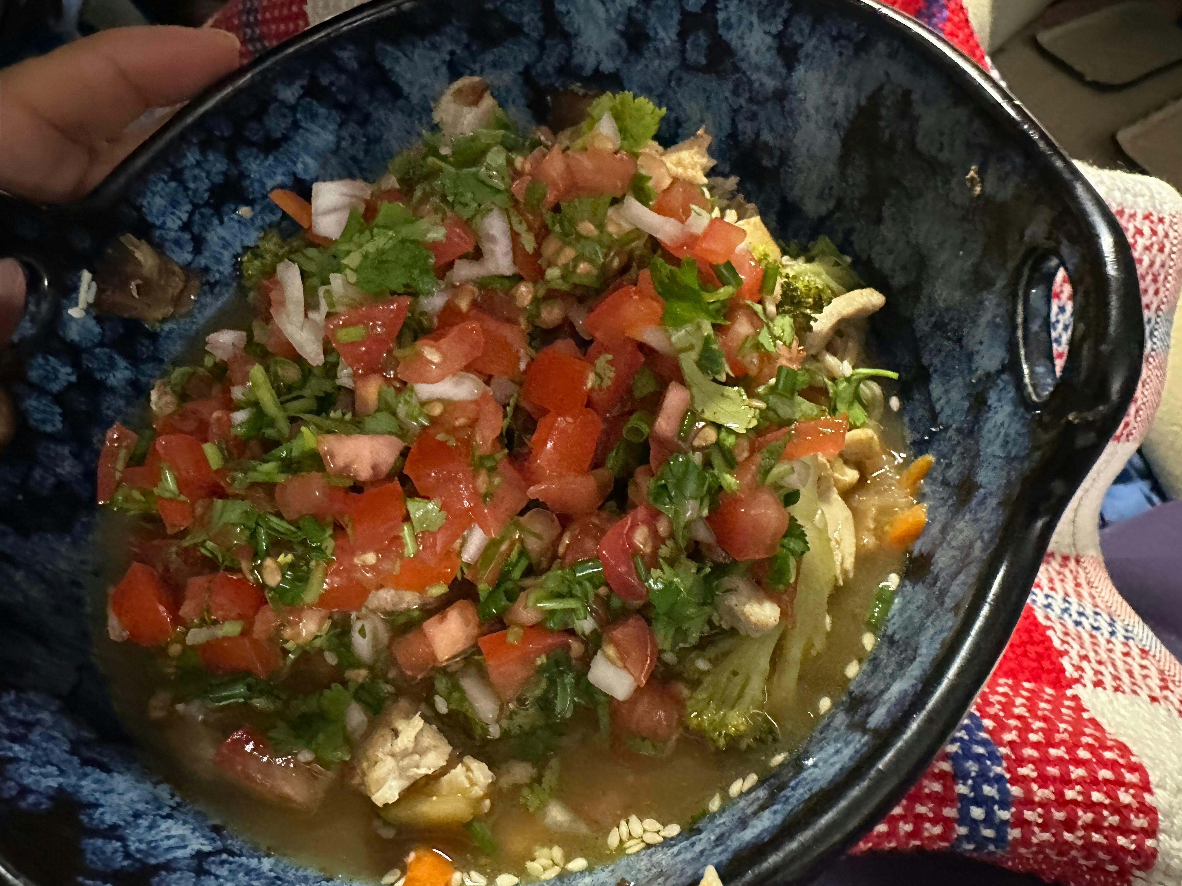 Creamy “Chicken”: Onions, Parsley, Corn, Garlic, Carrots, Bell Pepper, Cilantro, Peas, Rosemary, Thyme, Oregano, Basil, Cherry Tomatoes, Celery, Roasted Kale, Blanched Napa Cabbage, Sesame Seeds